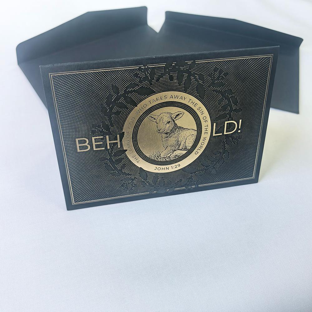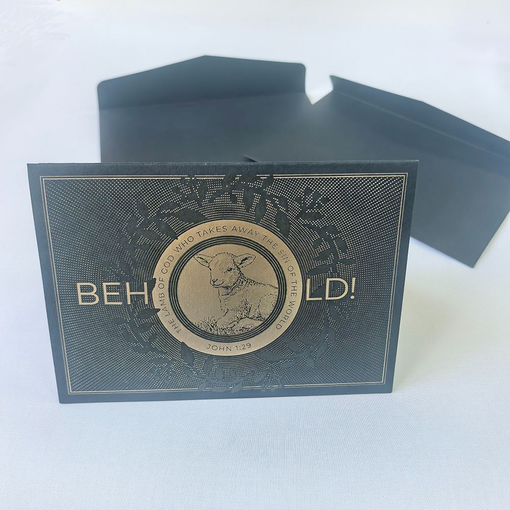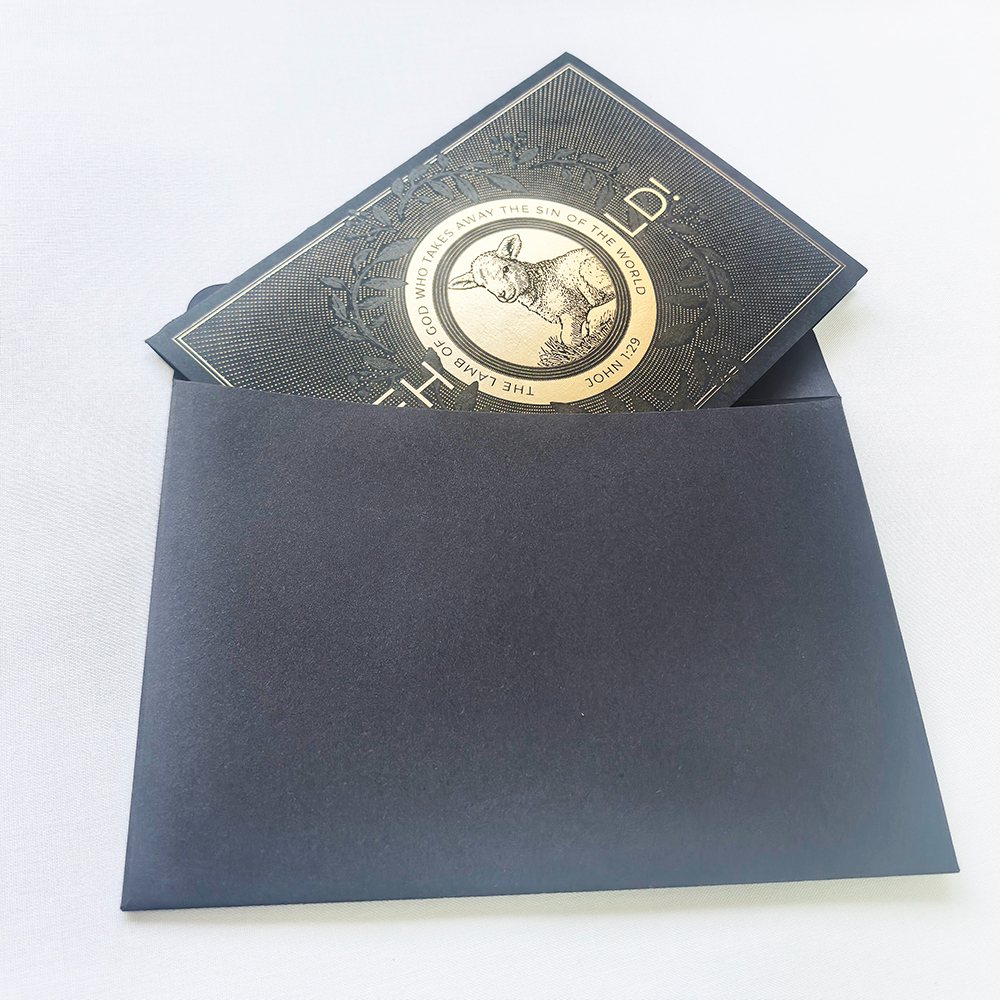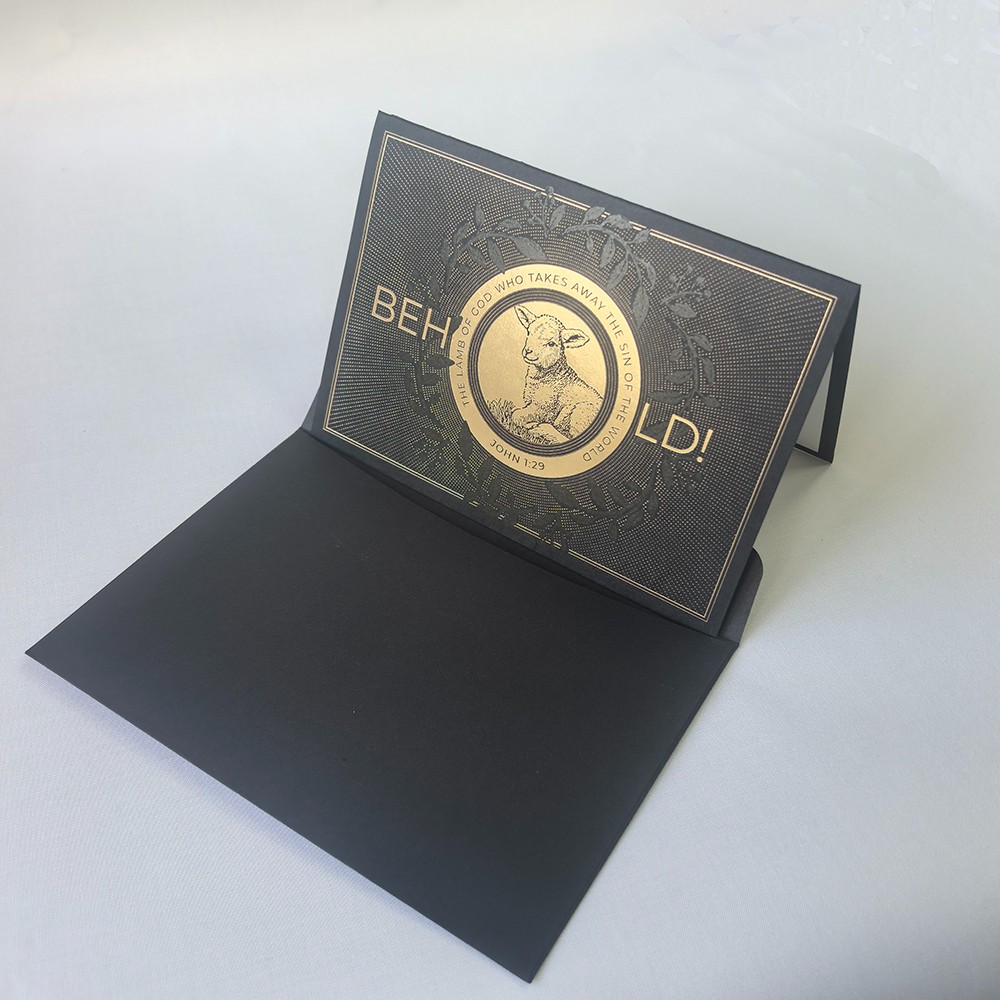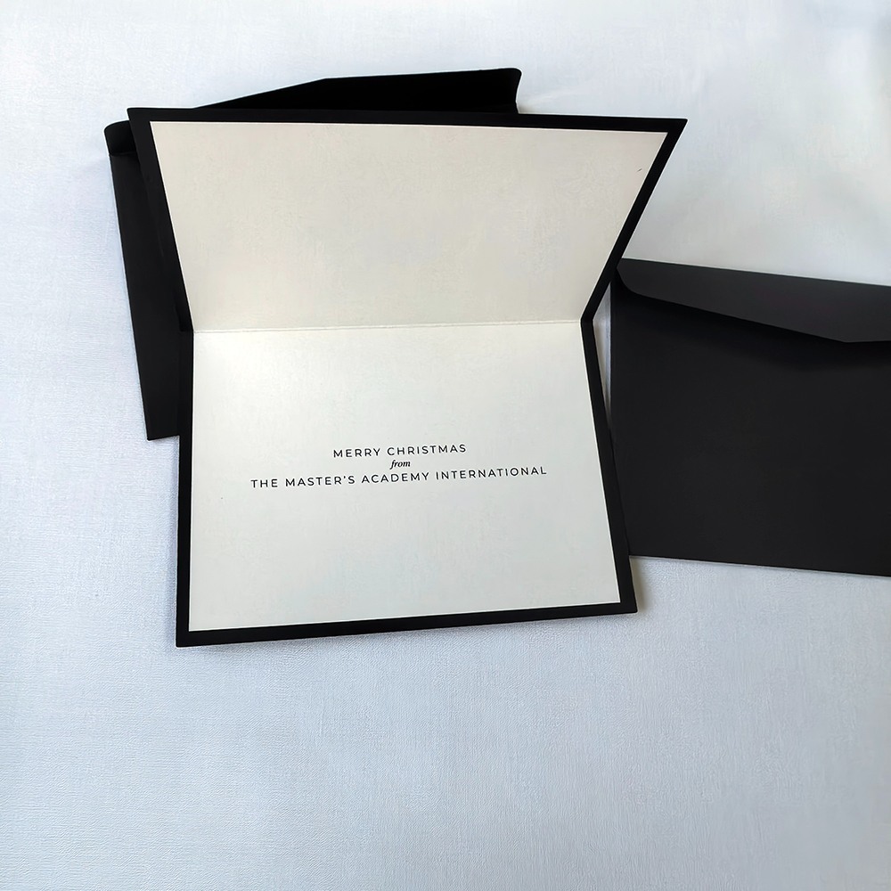 Sunnywell Printing is a direct Christmas card factory supplier,the Christmas card is black/Green color card, fold in half, the surface is with foil stamping and deboss, and UV printing logo.the card we used is thick FSC certification material