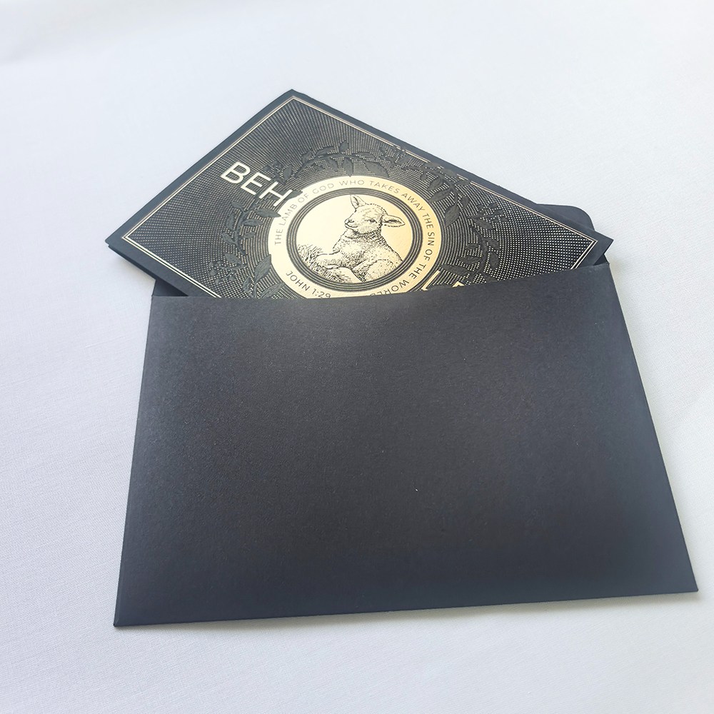 Thank you card Size: 100x140mm cards per set: 10 cards per envelope Paper: 350gsm card paper/C1S, printing: full color one side, black color back , foil stamping